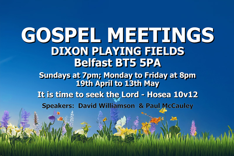 Along with several other Assemblies in east Belfast are holding Gospel meetings in Dixon Park. If you are free you will be made welcome but if not you can hear the last meeting by clicking the picture above.